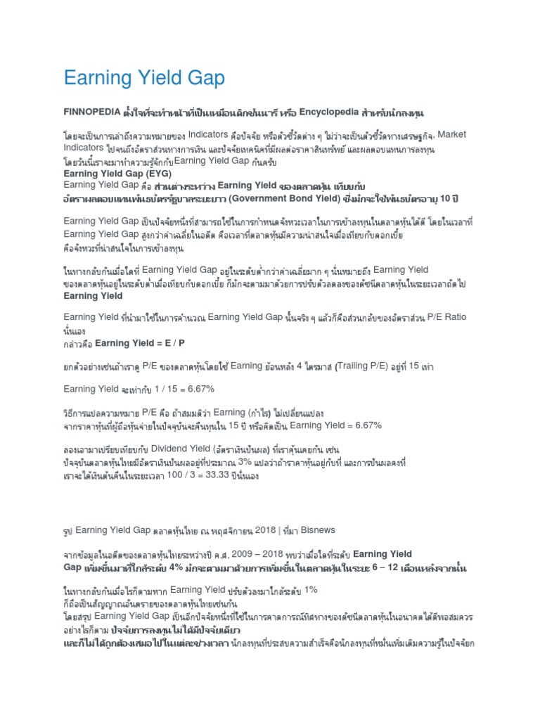 Earning Yield Gap - BUALUANG FUND from bualuang.fund Accordingly, the amount that the current real gdp is greater then the historic average is called an inflationary gap, as this will. The reverse yield gap is the amount by which the yield on bonds exceeds the yield on equity or, in other earnings yield shows the percentage of each unit of currency invested in the stock that was earned. Es un modelo de valoración del mercado bursátil basado en la mera comparación de dos ratios de rentabilidad: