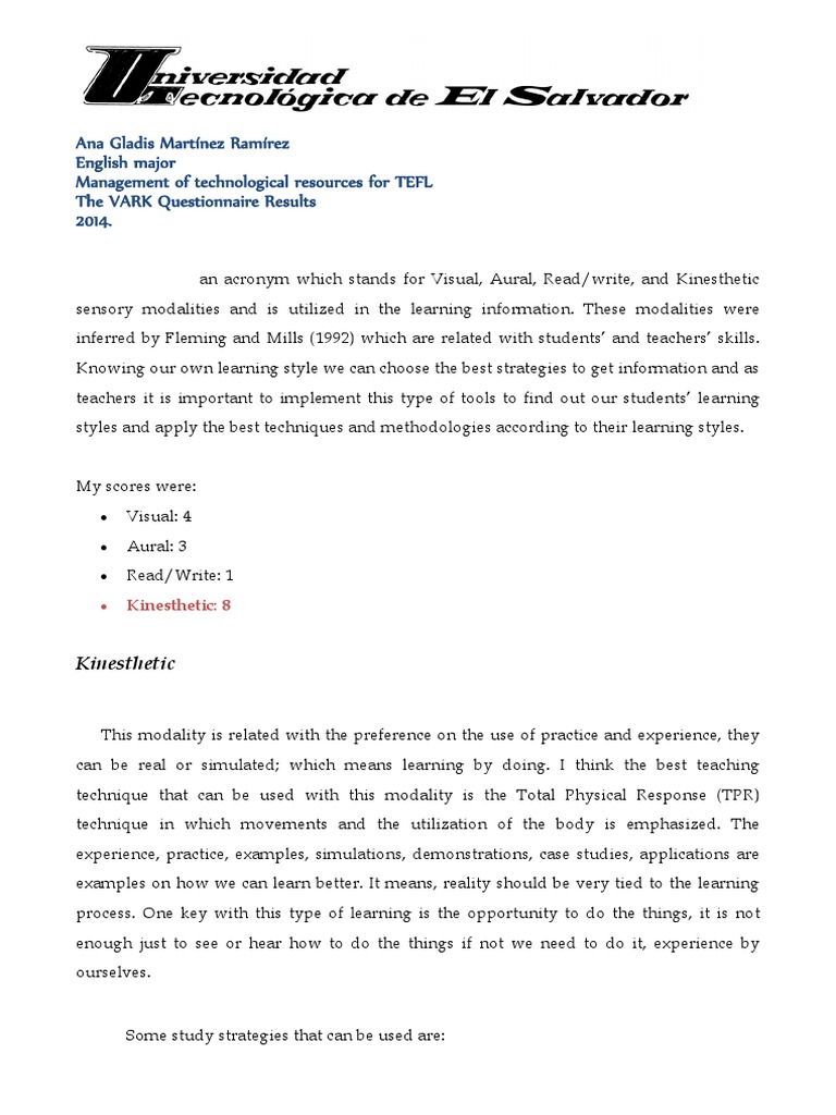 The VARK Questionnaire Results | Learning Styles | Epistemology from imgv2-1-f.scribdassets.com Watch others play the game before joining in. A learning style questionnaire thus tests what channels a person is happy to use for learning. Some of the most famous learning style models proposed by experts in the 20th century include fleming and mills' vark model, gardener's theory of multiple intelligences, and kolb's experiential.